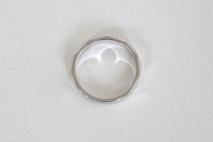 光を受けて輝く多面カットの結婚指輪です。指先で華やかな存在感を放ちます。