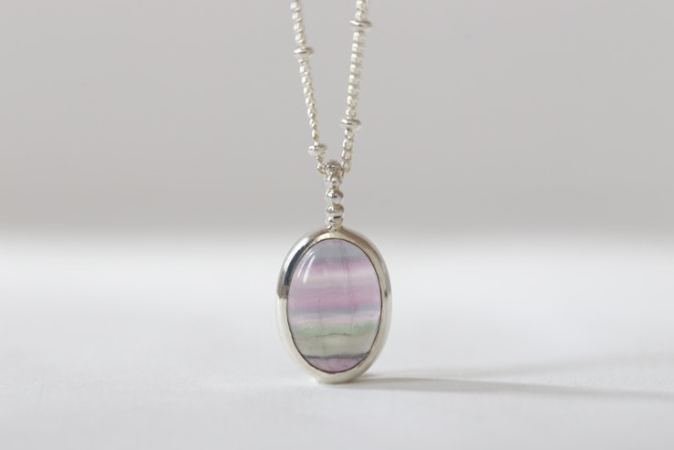 SV925フローライトネックレス 素材 SV925 フローライト サイズ タテ 約23.0mm×ヨコ 約20.0mm 全長 45cm フローライトのグリーンとパープルの濃淡の美しい縞模様がお楽しみ頂けます。バチカン部分は正十二面体をモチーフにしたカットボールでアクセントを付けました。